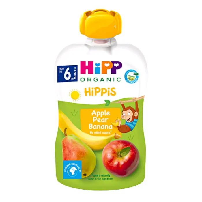 Qull Hipp: Mollë, dardhë dhe banane, nga 4 muaj, 100 gr. Nuk përmban produkte të modifikuara gjenetikisht. Nuk përmban sheqer të shtuar.
